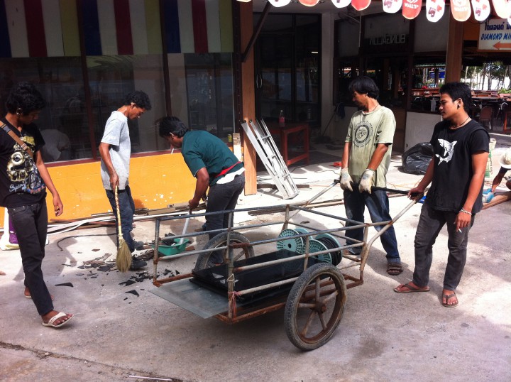 I just watched 2 construction workers take a payload of glass panes from their site up to the edge of the jungle and toss pane after pane into the jungle. It was really sad to watch. No concern given to the beautiful area they live in, Railay Beach in the gorgeous area of Krabi, Thailand. Or maybe no better way to dispose of it and I just don't understand the way things are. However, I simply refuse to believe that it is OK. It was obviously know as wrong at some level to them since right after I walked up drop jawed and started to pull my camera out, they stopped and took a couple steps back. After I walked on I looked back to see them resume their environmental neglect. I came back about 10 minutes later and took some pictures of the glass landing zone and then another shot of them filling up another payload of glass to be thrown into the "pristine" jungle. Boo!